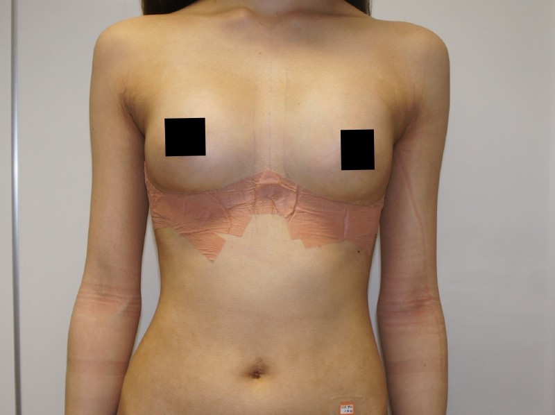 だいぶ腫れも引いてくるころですがもともとなかったバスト部分に結構なボリュームがいきなり入ってくるので皮膚にテンションがかかっていて“パンッ”と張った感じです。