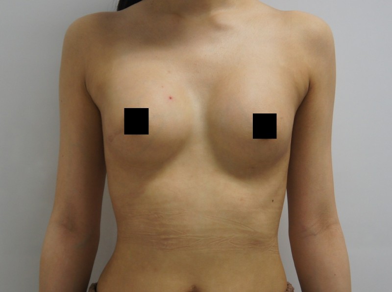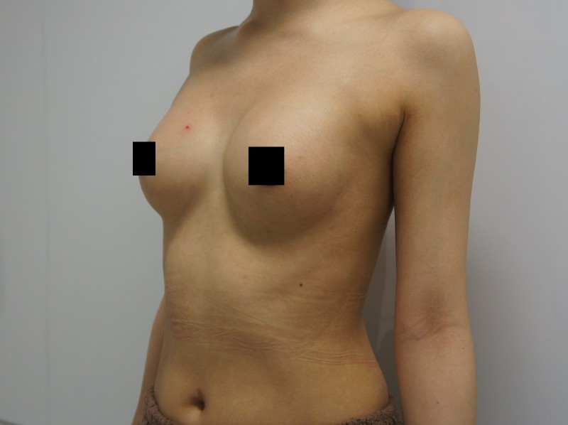 写真を見てわかるように術前から結構な左右差があります。(ボリューム・高さ・乳輪位置)