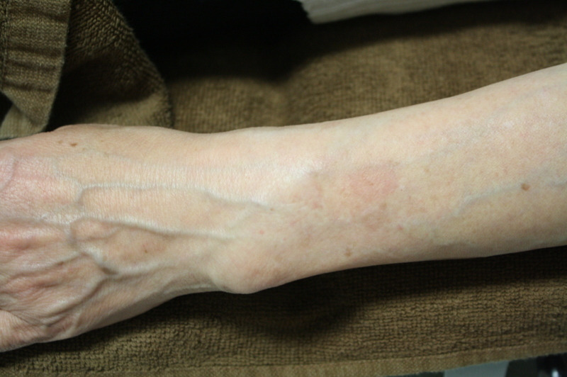 で今回のモニターさまは、腕のシミに対してQ-スイッチYAGレーザーを照射しました。